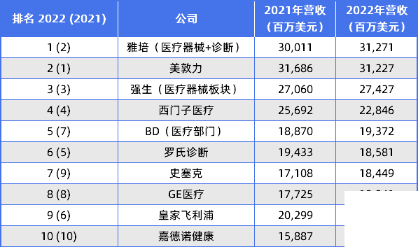 前10強中,排名上升的僅有BD和史塞克,強生(醫(yī)療器械板塊)、西門子醫(yī)療繼續(xù)蟬聯(lián)前三、四。