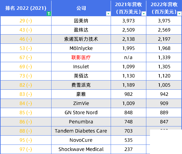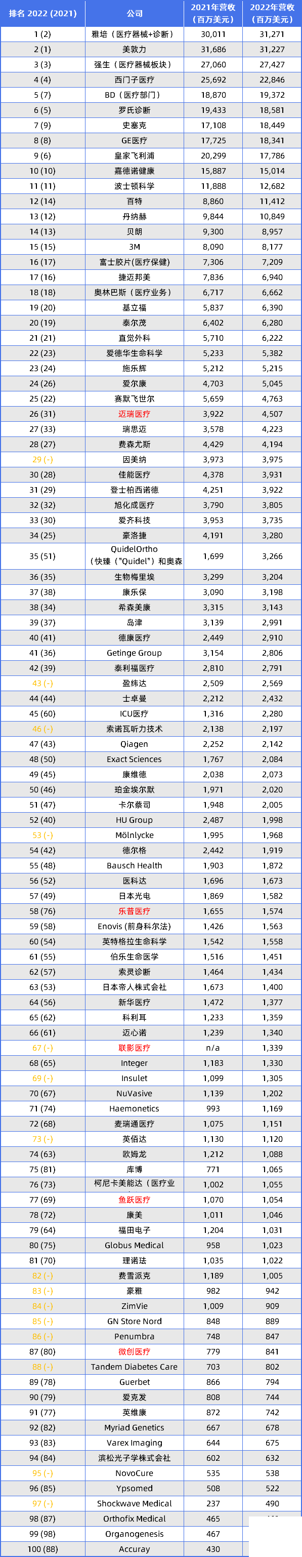 “Medtech insight第三方權(quán)威網(wǎng)站發(fā)布了全球醫(yī)療器械100強榜單。排名依據(jù)2022年醫(yī)療器械企業(yè)銷售額。據(jù)統(tǒng)計,本次入選百強的所有械企總年營收達到了4666.6億美元,總收入增長0.6%,這是繼新冠疫情第一年罕見下降后連續(xù)第二年增長。”