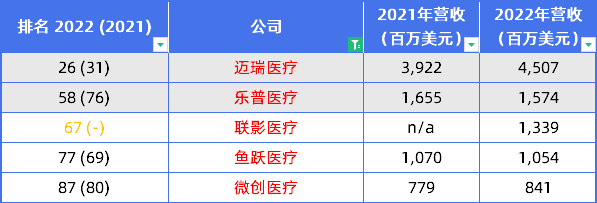值得注意的是,本次有五家國產(chǎn)械企進入全球醫(yī)療器械100強榜單:其中邁瑞醫(yī)療排名自31名上升至26名,樂普醫(yī)療自76名上升至58名,聯(lián)影醫(yī)療首次進榜便位居67名。