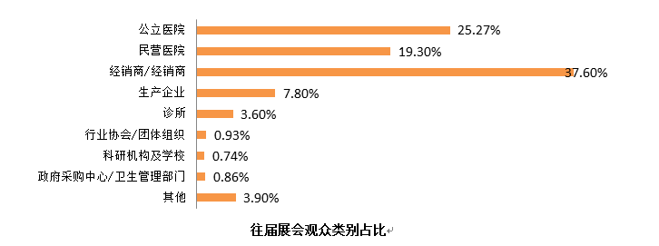在已成功舉辦的各屆醫(yī)博會(huì)中,組委會(huì)通過(guò)積累豐富的行業(yè)客戶資源,以及與各級(jí)醫(yī)療行業(yè)學(xué)會(huì)、協(xié)會(huì)、商會(huì)、行業(yè)媒體、行業(yè)平臺(tái)等單位溝通合作, 專注于邀請(qǐng)參展商重點(diǎn)關(guān)注的專業(yè)買家到場(chǎng)參觀、交流、采購(gòu)。近年以來(lái),各屆醫(yī)博會(huì)到場(chǎng)觀眾人次均保持在1.5萬(wàn)至2.5萬(wàn), 包括各級(jí)公立醫(yī)院、民營(yíng)醫(yī)院、經(jīng)銷商、代理商、診所、醫(yī)療器械生產(chǎn)廠家等專業(yè)觀眾類別, 其中, 醫(yī)院和經(jīng)銷單位的到場(chǎng)客戶比例占全部觀眾的80%以上。