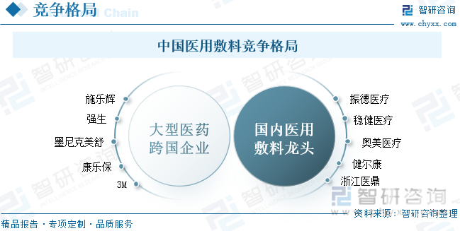 目前,從高端醫(yī)用敷料市場競爭格局來看,大部分市場由外資廠商主導(dǎo),如強(qiáng)生、3M、施樂輝、美敦力、康樂保、康維德等,國產(chǎn)占比相對較低。