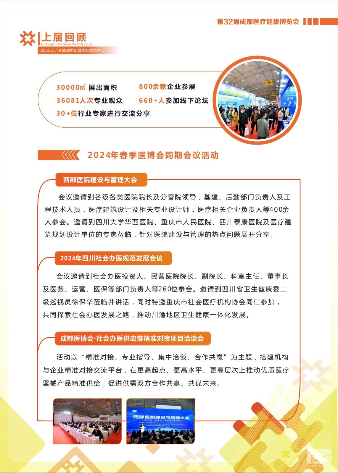 “成都醫(yī)療健康博覽會(huì)”(簡(jiǎn)稱:成都醫(yī)博會(huì))經(jīng)過(guò)二十多年來(lái)的不斷發(fā)展,擁有西部醫(yī)療衛(wèi)生行業(yè)龐大的數(shù)據(jù)資源,能為醫(yī)療行業(yè)提供更完善的采購(gòu)解決方案。醫(yī)博會(huì)在2020年通過(guò)Ufi認(rèn)證,正式進(jìn)入國(guó)際性品牌展會(huì)行列。博覽會(huì)同期舉辦醫(yī)院管理干部培訓(xùn)班、社會(huì)辦醫(yī)發(fā)展論壇、西部醫(yī)院醫(yī)療信息化大會(huì)、西部醫(yī)院建設(shè)與管理大會(huì)等高端學(xué)術(shù)會(huì)議,醫(yī)博會(huì)已成為西部醫(yī)療行業(yè)內(nèi)了解行業(yè)發(fā)展動(dòng)態(tài)、交流學(xué)術(shù)、采購(gòu)產(chǎn)品的重要平臺(tái)。