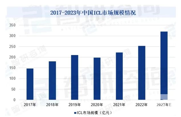 根據(jù)智研咨詢研報(bào),2017年我國(guó)ICL市場(chǎng)規(guī)模為147億元,2022年來(lái)到253億元,年復(fù)合增長(zhǎng)率約為11.47%,2023年將達(dá)到32 億元。