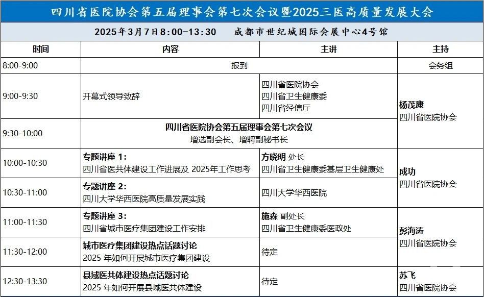 第五屆理事會第七次會議、2025三醫(yī)高質量發(fā)展大會:成都世紀城國際展覽中心4號館。
