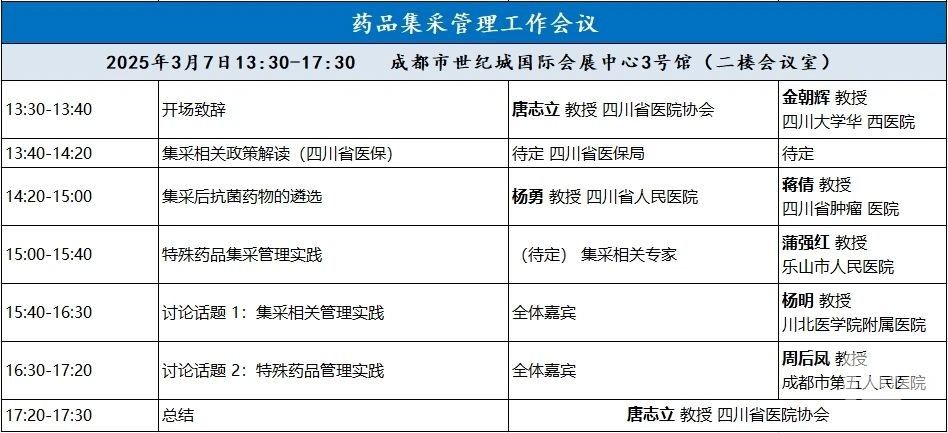藥品集采管理工作會議:成都世紀城國際展覽中心3號館二樓會議室。