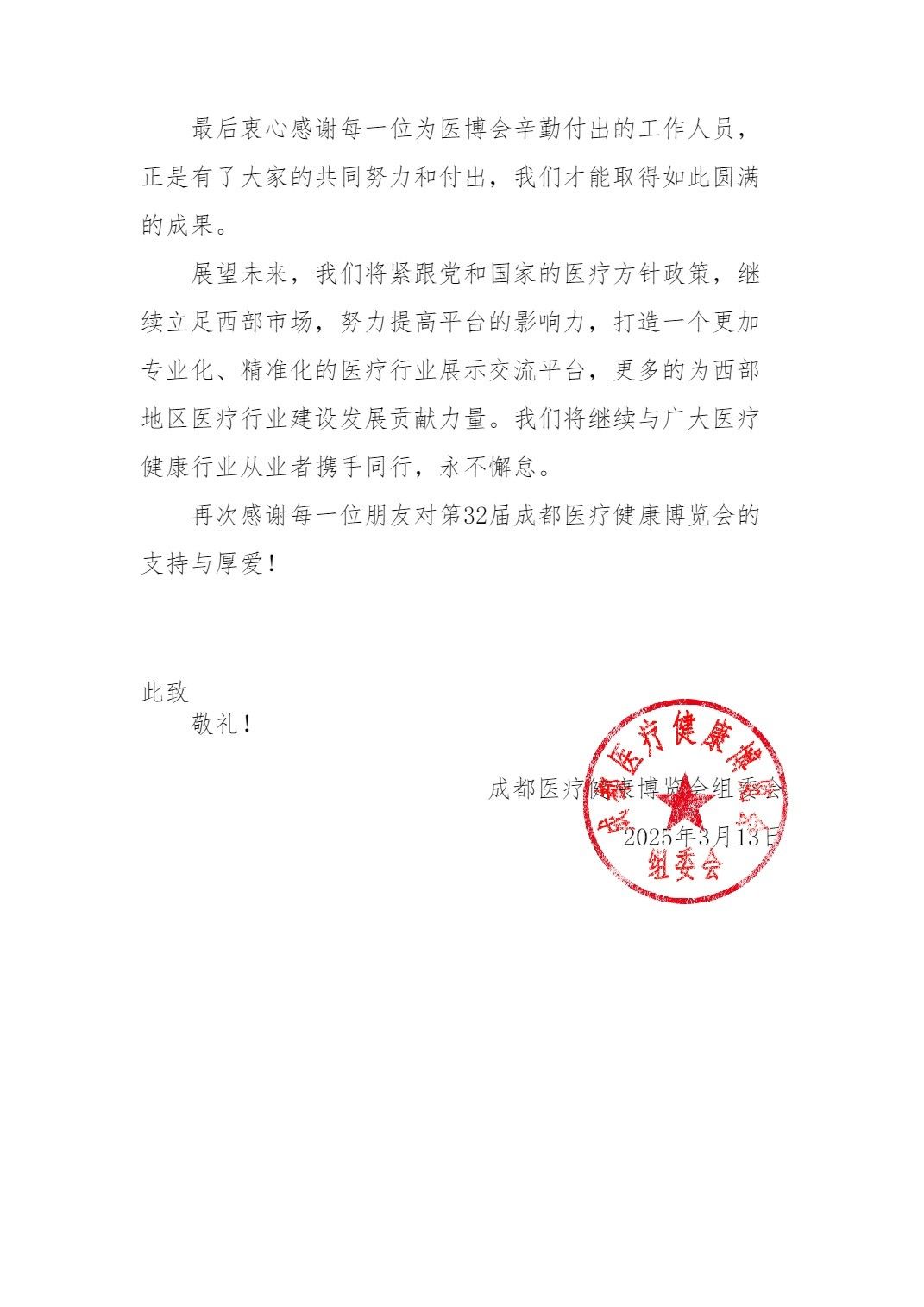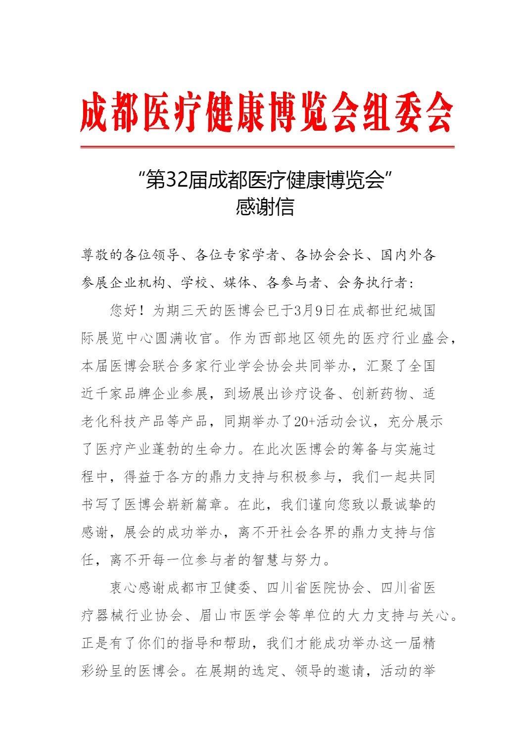 誠(chéng)摯感謝!一封來(lái)自第32屆成都醫(yī)療健康博覽會(huì)的感謝信
