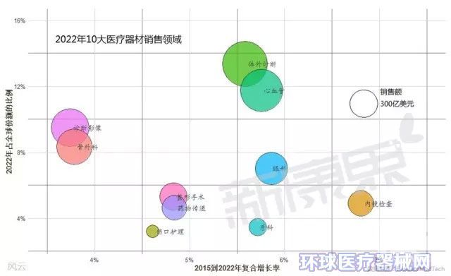 在醫(yī)療器械銷售領(lǐng)域方面,體外診斷仍將是最大的一塊,預(yù)測到2022年市場份額將達708億美元,占據(jù)醫(yī)療器械總市場的13%。其中,羅氏仍然將是體外診斷領(lǐng)域的領(lǐng)導(dǎo)者,其2022年的銷售額將達到128億美元。而僅次于體外診斷的是心血管方面,預(yù)測2022年全球市場將超過600億美元。這方面無可爭議的老大是美敦力,其銷售額將達到141億美元。內(nèi)鏡檢查方面的器材市場增長較快,預(yù)測未來幾年的復(fù)合增長率達到6.8%。