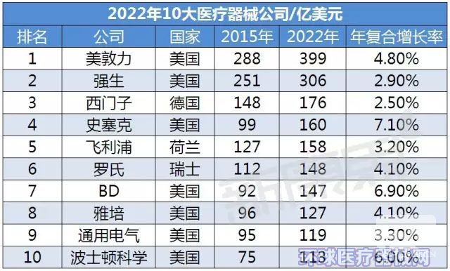 而在公司方面,美敦力仍將保持全球醫(yī)療器械銷售額的頭名,而且優(yōu)勢越來越大,其未來幾年的復(fù)合增長率接近5%,到2022年銷售額將達到399億美元,強生緊隨其后,銷售額也將超過300億美元,強生不愧為全球最大的醫(yī)藥公司,在EvaluatePharma發(fā)布的全球處方藥銷售額中強生以398億美元位列第5位。而另外一家在制藥和醫(yī)療器械方面都堪稱巨頭的公司是羅氏,其醫(yī)療器械2022年銷售額預(yù)測將約為148億美元,制藥方面優(yōu)勢則更為明顯,羅氏最近幾年藥物銷售額增長較快,到2022年或?qū)⒊蔀槿蛱幏剿庝N售首位。